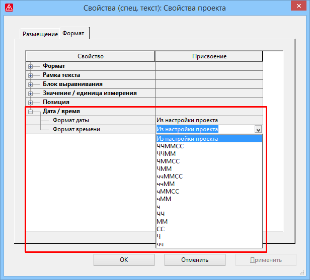 Кроме того, для свойств проекта, которые размещены в виде специального текста, доступны новые настройки форматирования. Для этого вкладка Формат под новым уровнем иерархии Дата / время была дополнена двумя свойствами отображения Формат даты и Формат времени.