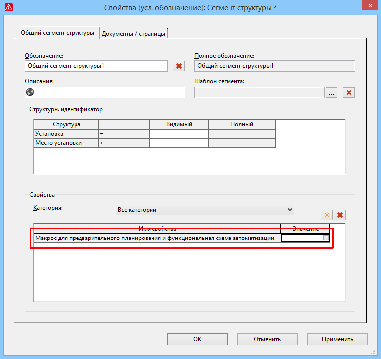 Для этого на первой вкладке в диалоговом окне 'Свойства' доступно новое свойство Макрос для предварительного планирования и функциональная схема автоматизации (ид. 44084). Если для свойства выбран макрос окна с видом представления "Предварительное планирование" и / или "Функциональная схема автоматизации", с помощью функции перетаскивания вы можете разместить этот сегмент на странице проекта соответствующего типа страницы вместе с фрагментами, имеющимися в макросе окна.