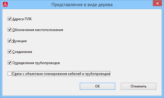 Вид в представлении структуры дерева навигатора предварительного планирования может быть неудобным для просмотра. Ввиду этого в диалоговом окне Представление в виде дерева существует возможность показывать или скрывать объекты, отображаемые по умолчанию для дерева, такие как адреса ПЛК, обозначения местоположения, функции и т. д., используя соответствующие флажки.