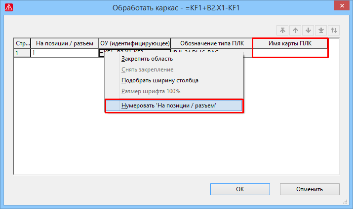 - С помощью нового пункта всплывающего меню Нумеровать "На позиции / разъем" выделенным картам ПЛК или всему каркасу можно присваивать значения свойства На позиции / разъем автоматически. В последующем диалоговом окне вводится начальное значение и величина шага для нумерации.