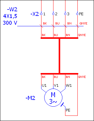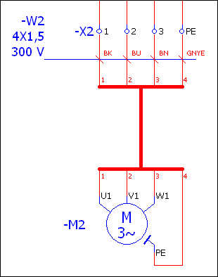- Проект содержит многополюсную страницу схемы соединений с кабельным соединением, которое, как отображено в примере ниже, представлено в виде жгута. Линия определения кабеля проходит в многополюсной области кабеля между источником кабеля и входящими в жгут символами выводов жгута. Точки определения соединения для кабеля обозначены цветами или номерами.