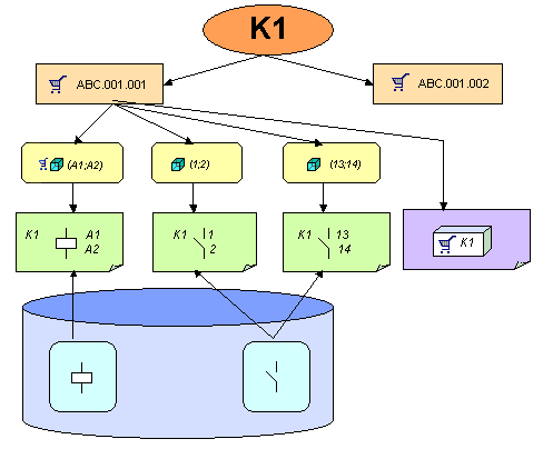 Устройства являются логическими электротехническими или (гидравлическими / пневматическими) взаимодействующими единицами Fluid-Техники. Им присваивается обозначение устройства (ОУ), например M1, K1, X1, XS1, W1. Устройство состоит из одной или нескольких функций (двигатель, катушка, замыкающий контакт, размыкающий контакт и т. д.). Все функции с одинаковым ОУ относятся к одному и тому же устройству. Одна из функций является так называемой главной функцией. На ней можно выбирать / вводить изделия (исключения: клеммы (изделия можно сохранять только на главных клеммах), контакты штекера, выводы устройства сборной шины и соединения).